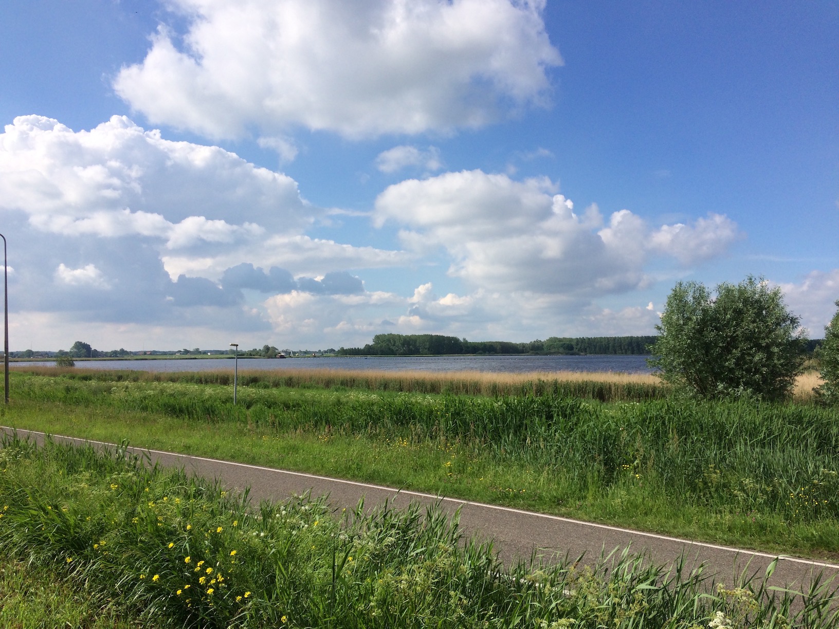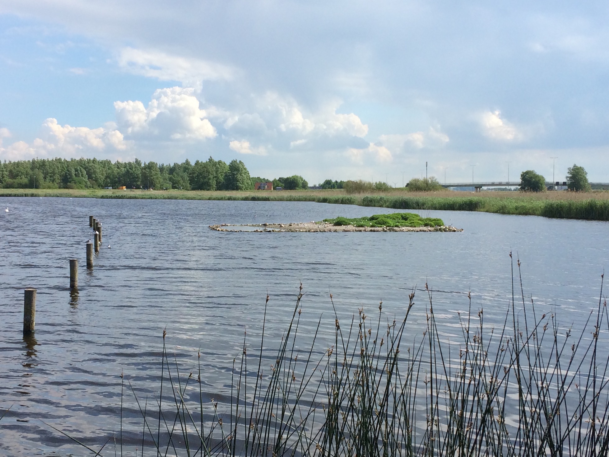 We followed the bike path to where it ran parallel with a one-lane road between two man-made lakes, the bird hide being on the bank of one of them. Here we left the bike path and walked along the embankment of Vlietland, the lake to our left. The path is normally a horse trail, but there was enough space to walk along it if we came across a horse and rider. Though we had to step aside when a man on a quad bike tore down the path leaving us in a wake of dust!