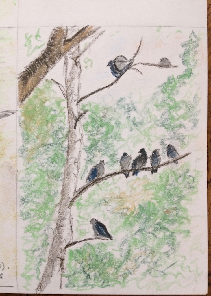 pastel-pencil-sketch-of-pigeons-in-a-treeI was particularly drawn to that rock dove, or feral pigeon, as they seem to come in different colours: some are blue, some are more black, and there are white and reddish brown ones, and so forth. They tend to stick together and not associate themselves with the wood pigeon, though once I did notice the wood pigeon with them and they seemed to tolerate each other; however, they didn’t interact. The wood pigeon was just amongst the feral ones, minding its own business (the business of eating of course). I would have to investigate this a bit more to be sure.