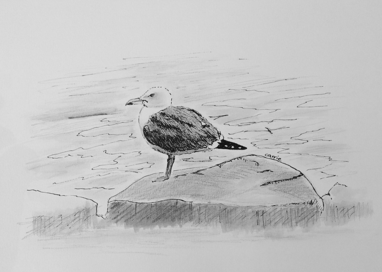However, the fun didn’t stop there; well, for me at least. It sparked an idea to write a simple little poem about the bird in the drawing – a herring gull standing on a small rock by the side of a loch in Edinburgh (see photo – please note a black/white filter has been applied).